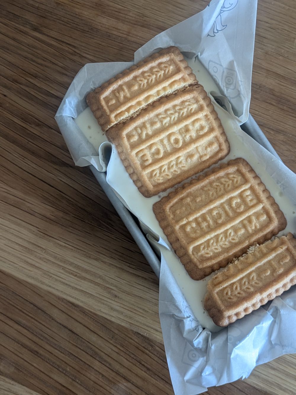 - ビスケットをジップロックなどに入れて、麺棒で叩いて細かく砕きます。